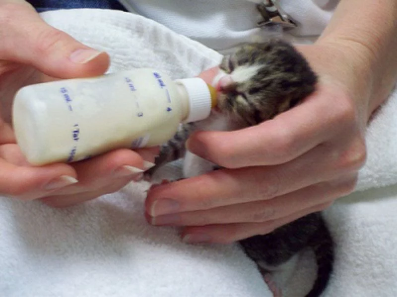 در فروشگاههای مخصوص حیوانات در برخی کشورهای پیشرفته، شیر مخصوص بچه گربهها در بازار موجود است. در صورتی که به این محصولات دسترسی ندارید، میتوانید از شیر بدون لاکتوز گاو استفاده کنید. برای دادن شیر در روزهای اول میتوانید مقدار کمی شیر ولرم را داخل شیشۀ شیر نوزاد یا سرنگ بدون سوزن بریزید و بسیار آرام به گربه بدهید. در صورت استفاده از سرنگ، قبل از دادن شیر، هوای داخل سرنگ را خالی کنید و مراقب باشید سرنگ را محکم یا سریع فشار ندهید. این کار باید بسیار آهسته انجام شود تا شیر به حلق بچه گربه نپرد. بعد از حدود سه هفتگی میتوانید شیر را در یک ظرف کوچک بریزید و بگذارید گربه خودش شیر را لیس بزند.