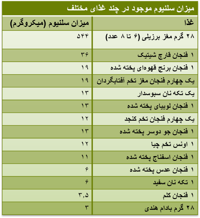 همانطور که مشاهده میکنید مغز برزیلی (نوعی آجیل) بیشترین میزان سلنیوم را دارد چون فقط در زمینهایی که سرشار از سلنیوم هستند به بار مینشیند. مقدار سلنیوم در این مغز آنقدر زیاد است که خوردن فقط یک مغز در روز میتواند تمام نیاز روزانهٔ بدن به سلنیوم را تامین کند و خوردن بیش از ۳ عدد آن در روز میتواند باعث مسمومیت سلنیومی شود. به همین دلیل توصیه میشود بیش از یک یا دو مغز آن در روز خورده نشود.